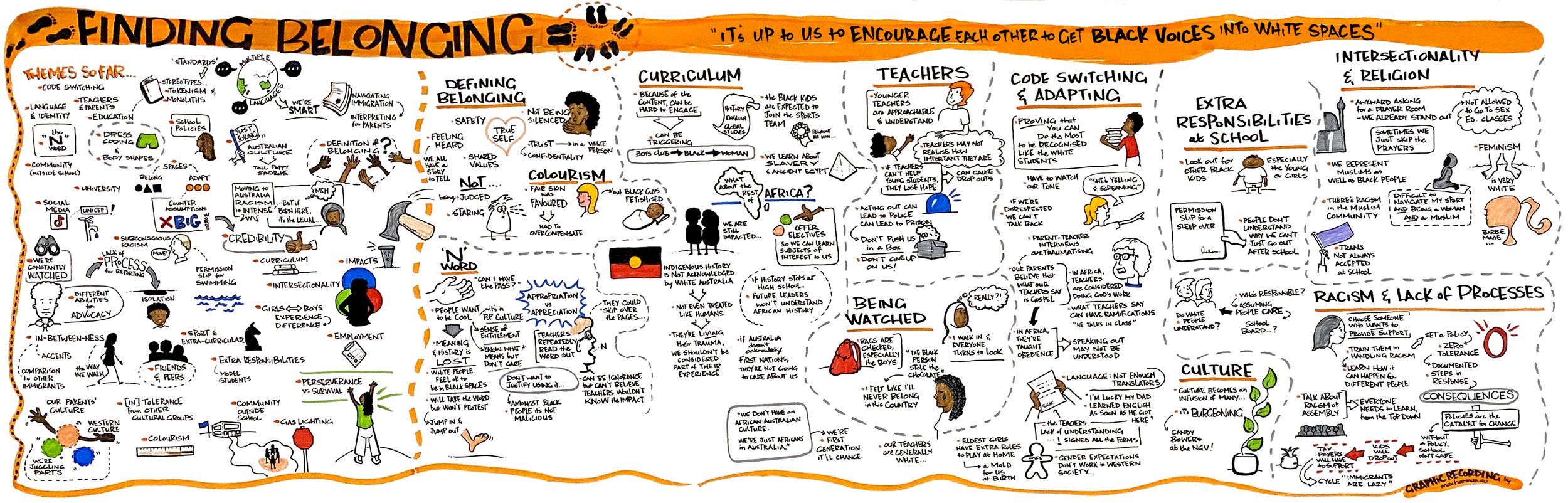 This graphic illustration was captured by graphic recorder Max Harman during a workshop in Adelaide with our research team in early 2024. It records conversations with the youth co-researchers analysing the peer conversations that were held with approximately 40 African diaspora young people during the first phase of our study to understand experiences of un/belonging for African diaspora young people, particularly in Australian schools. Click here to learn more about Phase 1 of our research.